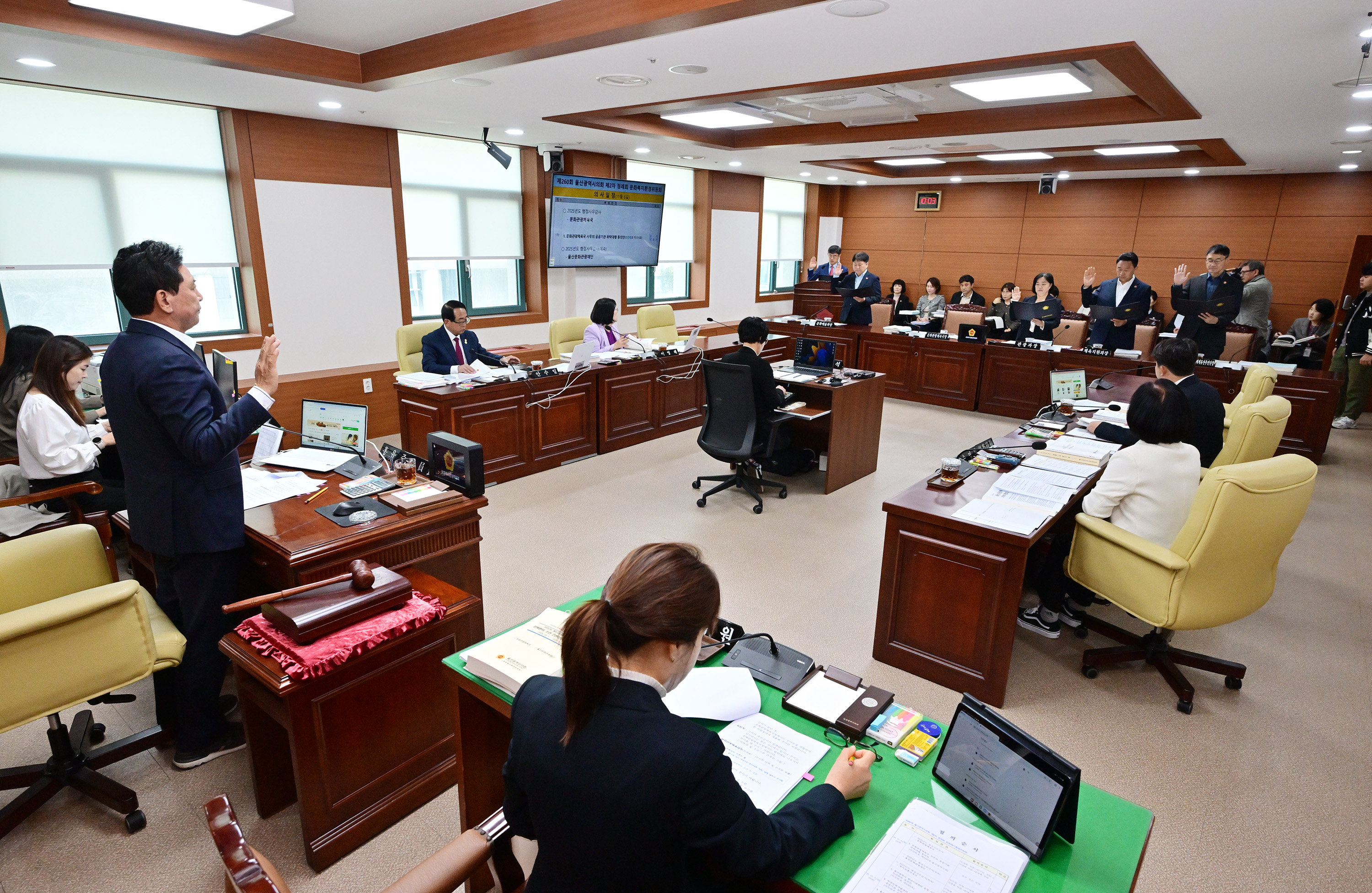 인사말 울산을 위해 최고의 의정활동을 펼치겠습니다. 5분자유발언 자유발언 내용을 확인하실 수 있습니다. 서면질문답변 시정 질의 문답을 확인하실 수 있습니다. 포토갤러리 문화복지환경위원회, 문화관광체육국·울산문화관광재단 소관 2025년도 행정사무감사 2025-11-06 더보기 의회운영위원회, 2025년도 의회사무처 소관 행정사무감사 2025-11-05 더보기 제99주년 한글 점자의 날 기념식 2025-11-04 더보기 제260회 제2차 정례회 제1차 본회의 2025-11-03 더보기 더보기